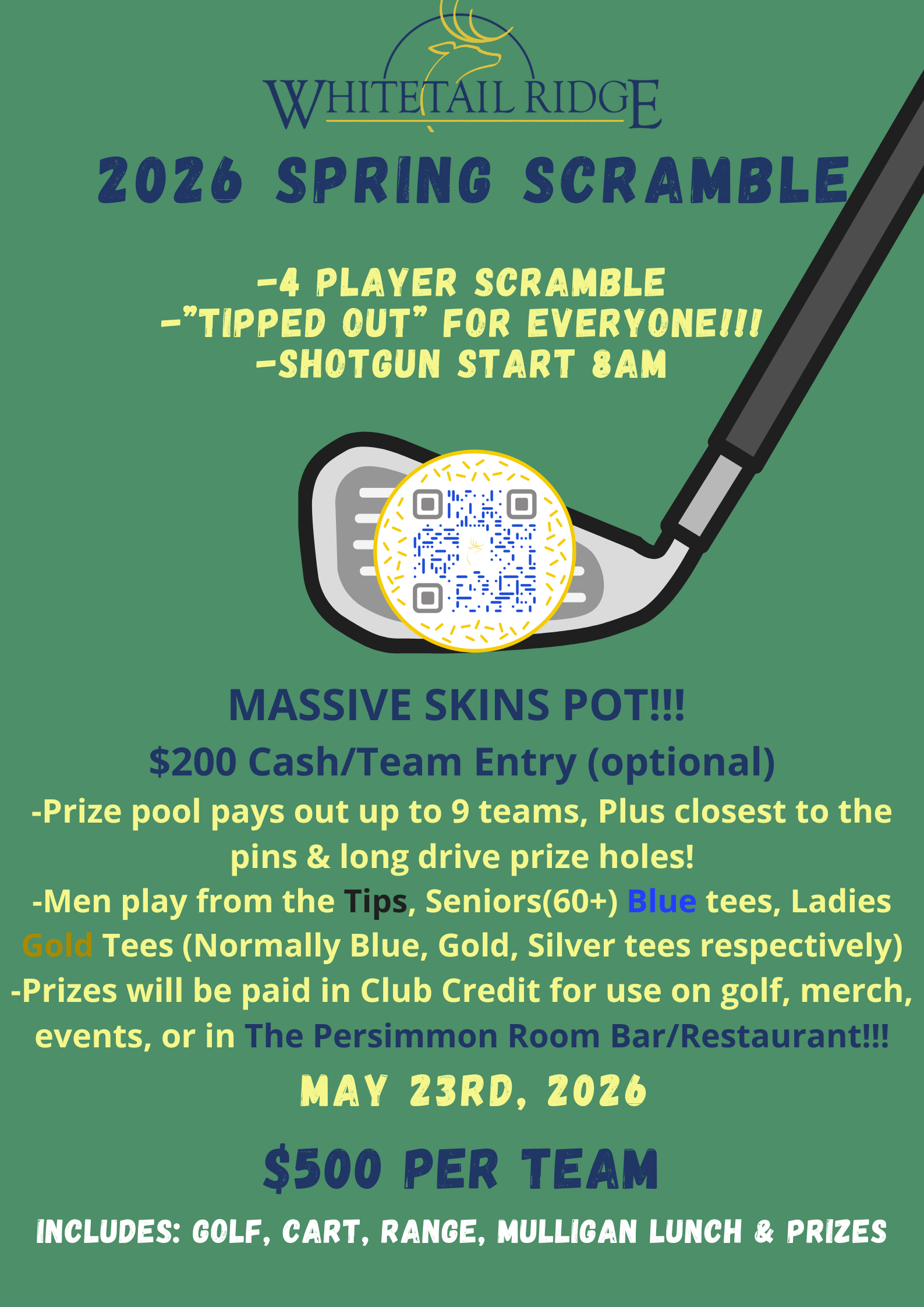 Men play from the tips. Seniors (60+) from the blues. Ladies from the golds. Prizes in club credit. Includes golf, cart, range, lunch, & prizes.
